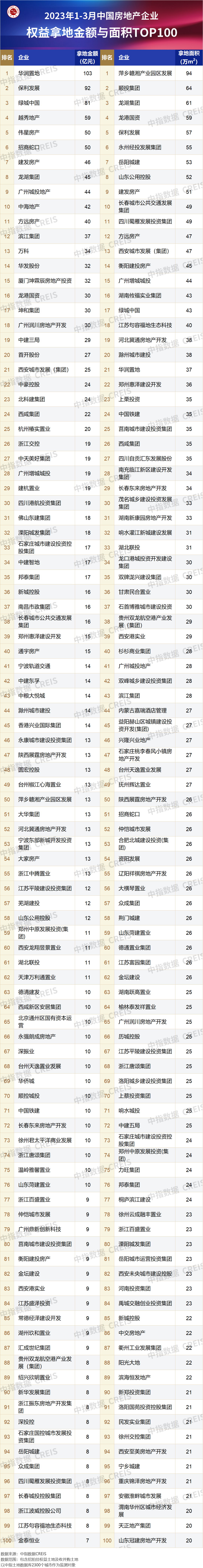 【推荐】2023年13月全国房地产企业拿地TOP100排行榜欣源置业集团有限公司董事长