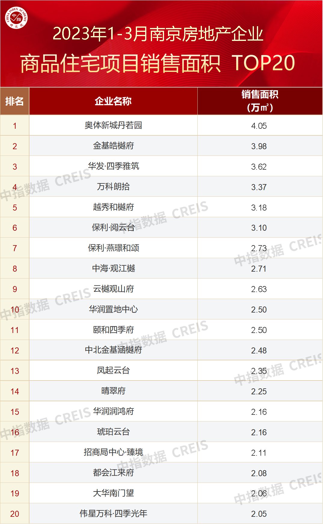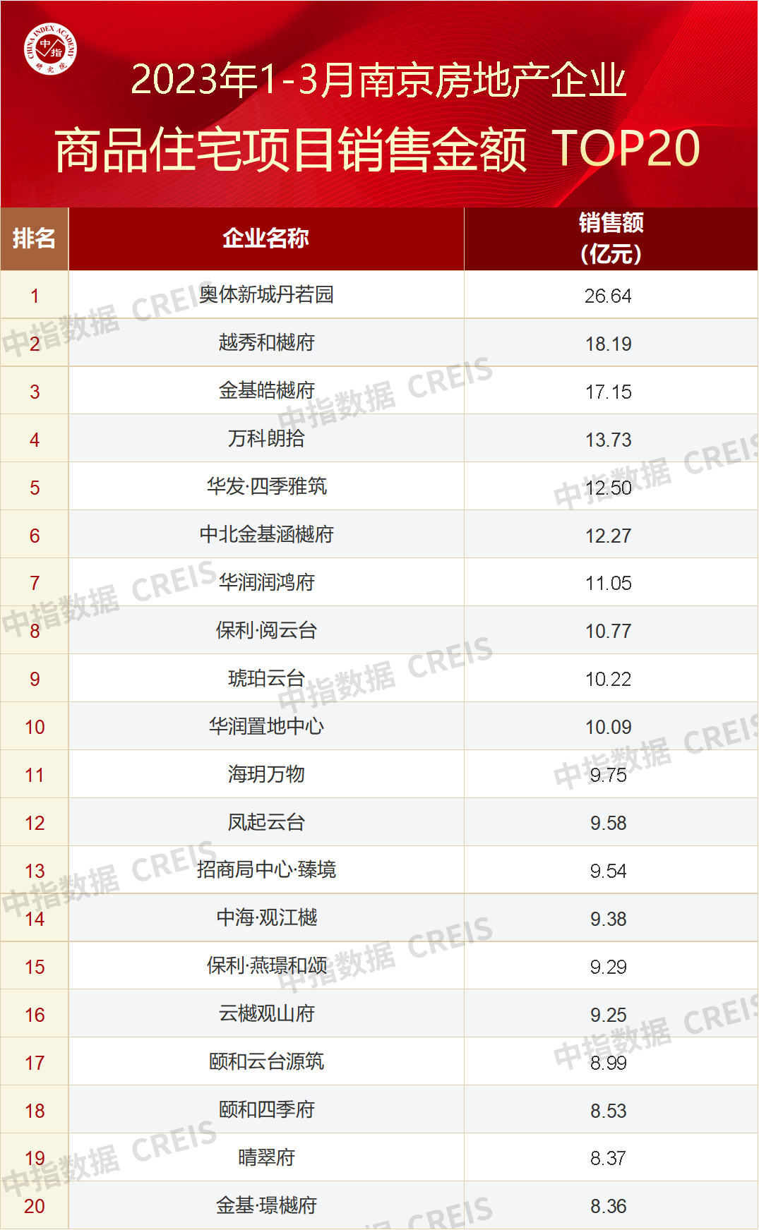 在南京的销售监测数据;本报告所提到的TOP20企业合计销售金额与面积均剔除了合作开发项目的重复计算额。
