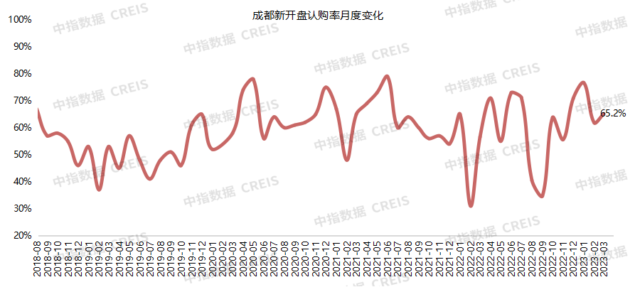 3月成都监测开盘套数约5900套,同比增加约2600套,环比增加约600套,平均认购率约为65.2%。