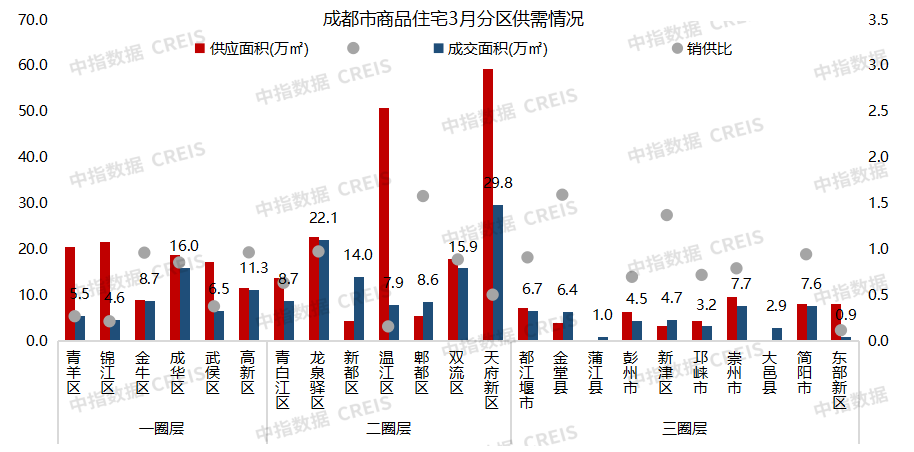 天府新区3月商品住宅成交面积为29.8万㎡,为成都市最高,其次为龙泉驿区成交面积为22.1万㎡。天府新区3月商品住宅供应面积为59.3万㎡,为成都市最高,其次为温江区。
