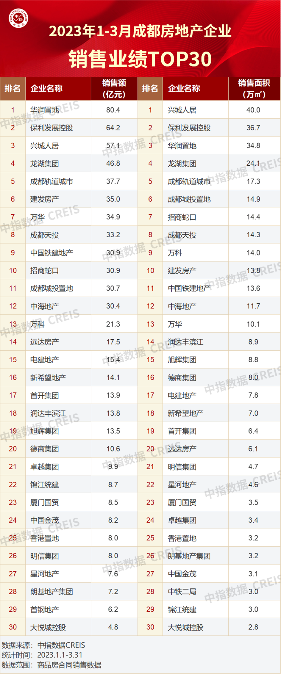 【推荐】2023年13月川蓉房地产企业销售业绩TOP30中海地产成都分公司