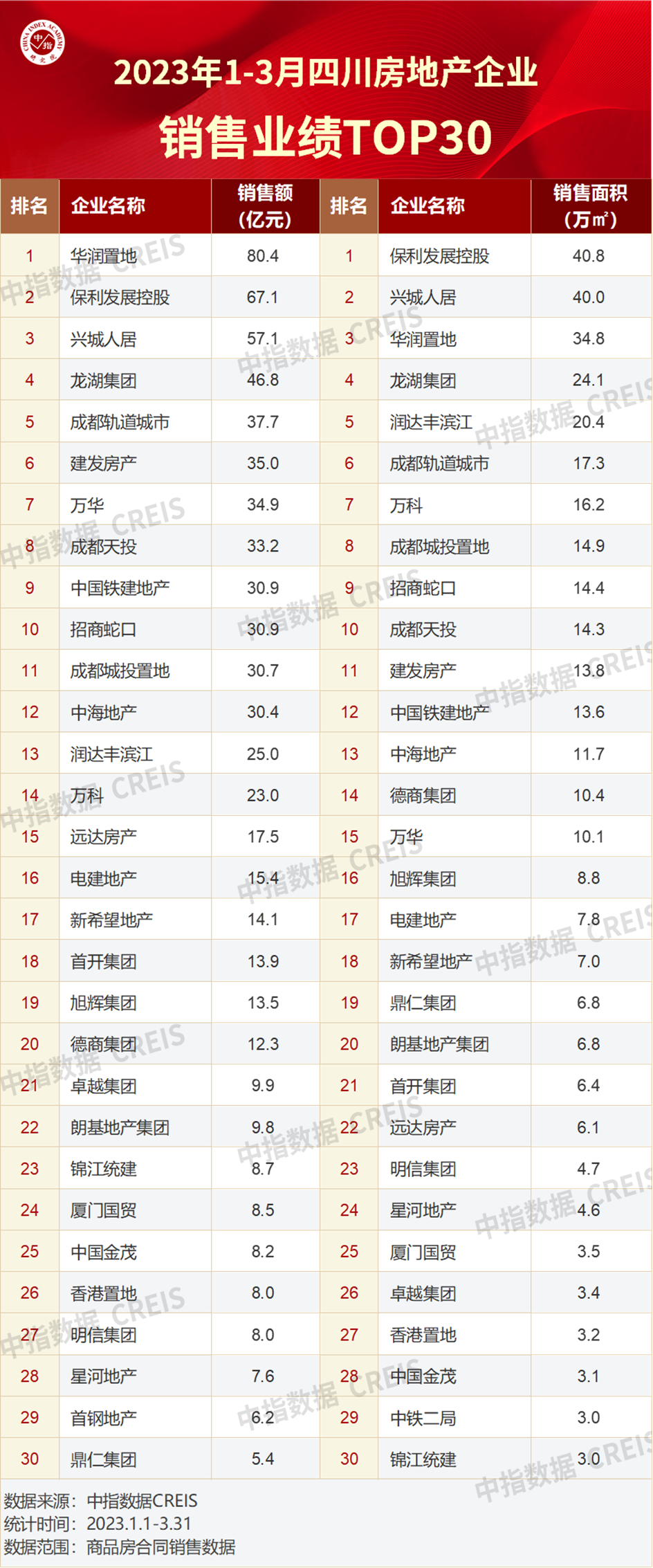 四川省2023年1-3月房地产销售业绩TOP30企业合计销售金额730.1亿元,同比增加25.5%;TOP30企业合计销售面积374.7万方,同比下降28.4%。12家房企在川销售金额超30亿元,分别为华润置地、保利发展控股、兴城人居、龙湖集团、成都轨道城市、建发房产、万华、成都天投、中国铁建地产、招商蛇口、成都城投置地和中海地产,此外润达丰滨江、万科在川销售金额超20亿元。