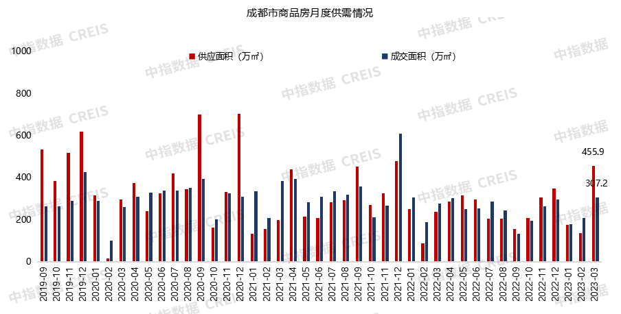 3月,成都市商品房供应面积为455.9万㎡,环比上升228.7%,同比上升9%;成交面积为307.2万㎡,环比上升47.7%,同比上升10.4%。
