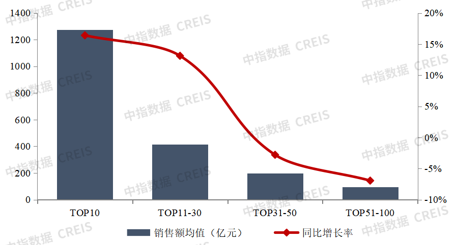 2023年1-5月,TOP30阵营房企销售额保持增长。其中,TOP10房企销售额均值为1274.9亿元,较上年增长16.4%;TOP11-30房企销售额均值为413.2亿元,较上年增长13.1%;TOP31-50房企销售均值为197.4亿元,较上年下降2.8%;TOP51-100房企销售额均值为94.0亿元,同比下降6.9%。