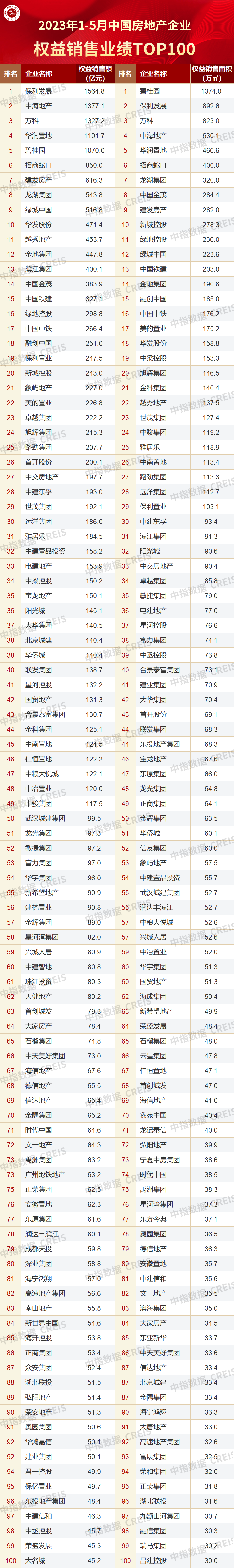 特别声明:房地产企业权益销售数据统计是以2023年1月1日-5月31日期间按股权比例销售的商品房为统计口径,主要依据中指数据CREIS在各地的销售监测数据,并参考当期总体经营情况和推盘去化情况进行分析统计;对于少数没有在监测范围内的城市或项目,由企业提供相关证明文件,经课题组对数据进行严格审核,也纳入统计范围。本报告仅供参考,课题组不对使用报告及其内容所引发的任何直接或间接损失承担责任。