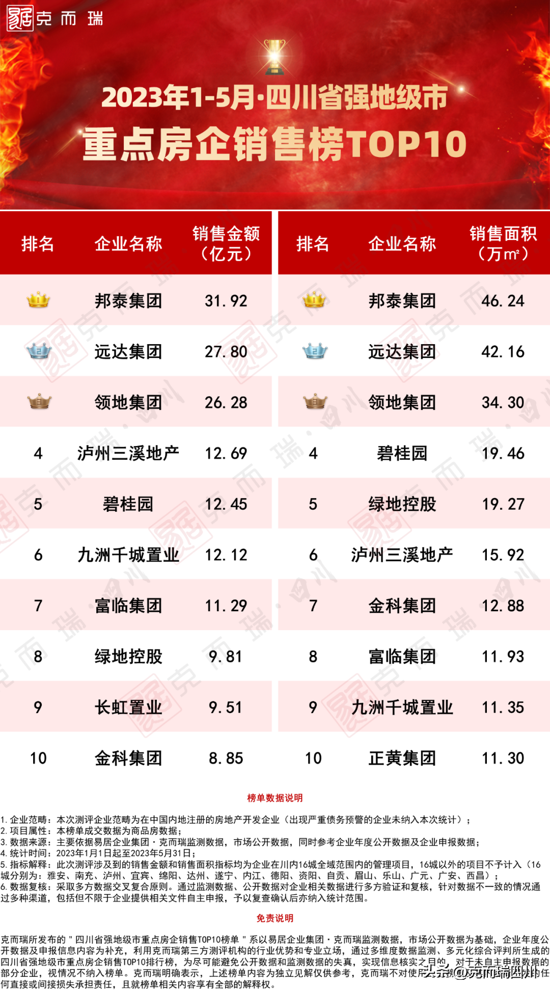 【推荐】2023年15月四川省强地级市重点房企销售榜TOP10成都本土地产公司