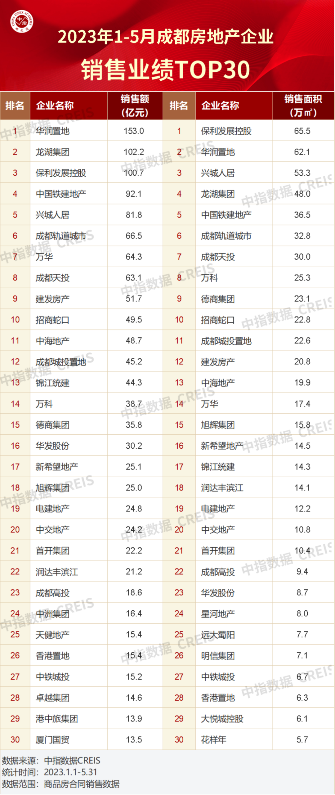 成都市2023年1-5月房地产销售业绩TOP30企业合计销售金额1333.2亿元,同比增加100.3%;TOP30企业合计销售面积637.8万方,同比增加58.3%。华润置地、龙湖集团和保利发展控股销售金额突破百亿,分别为153亿、102.2亿、100.7亿元。此外,中国铁建地产、兴城人居、成都轨道城市、万华、成都天投、建发房产销售金额超50亿元,招商蛇口、中海地产、成都城投置地、锦江统建销售金额40-50亿之间。