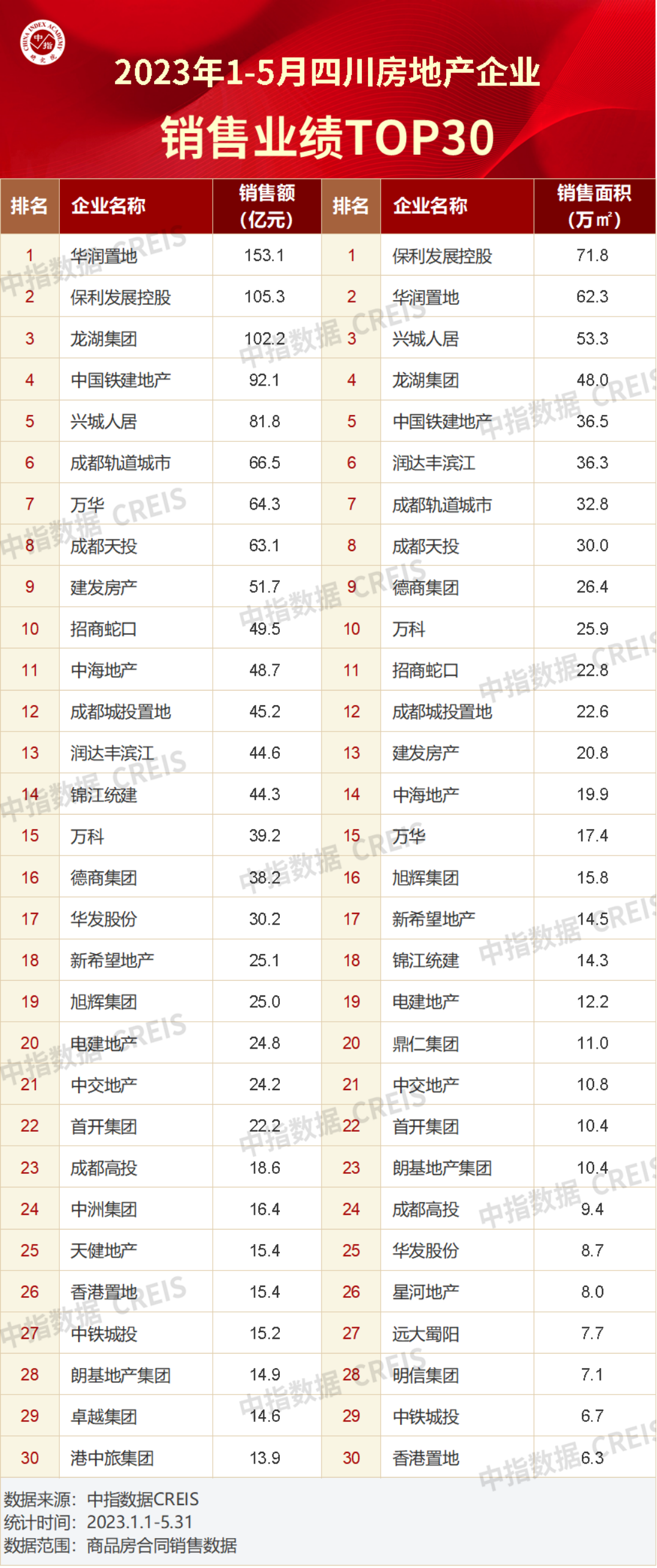 【推荐】2023年15月川蓉房地产企业销售业绩TOP30中海地产成都分公司