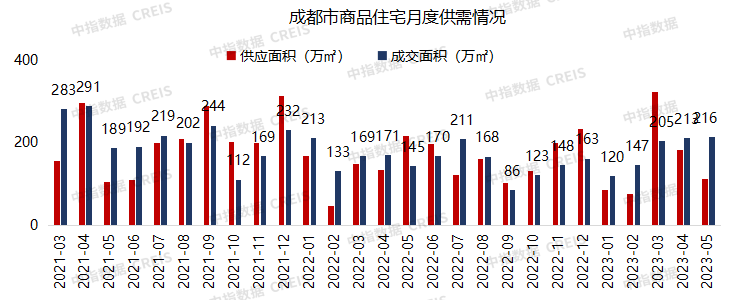 5月,成都商品住宅供应面积112万㎡,同比下降48%,环比下降39%。成交216万㎡,同比上升49%,环比上升1%。
