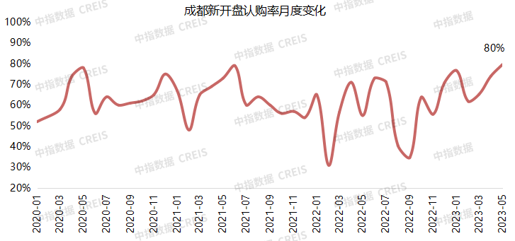 5月成都监测开盘套数约3300套,环比下降约1100套,同比下降约2800套。企业供应意愿持续下降。监测开盘的平均认购率约为80%,环比上升6百分点。