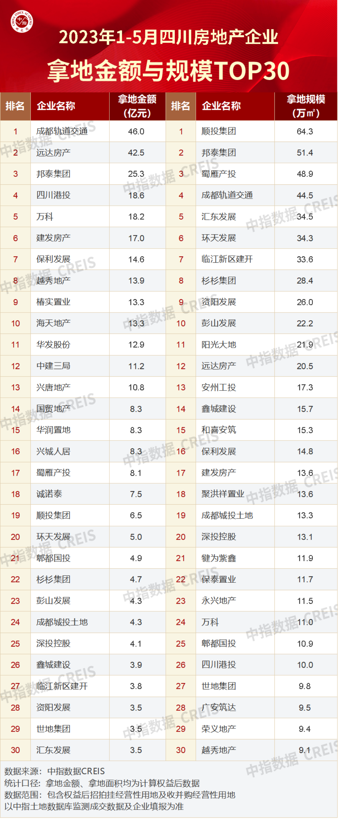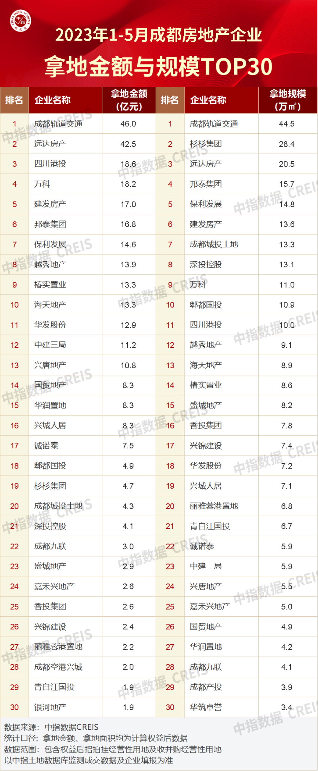 成都轨道交通以46亿元位列在蓉拿地金额TOP1,拿地规模44.5万㎡。远达房产在蓉拿地金额42.5亿元,位列第二,四川港投拿地金额18.6亿元,位列第三。
