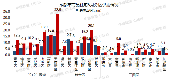 高新区5月商品住宅供应面积为15.7万㎡,为成都市最高,其次为天府新区,供应面积为15.6万㎡。天府新区5月商品住宅成交面积为32.9万㎡,为成都市最高,其次为龙泉驿区的20.1万㎡。