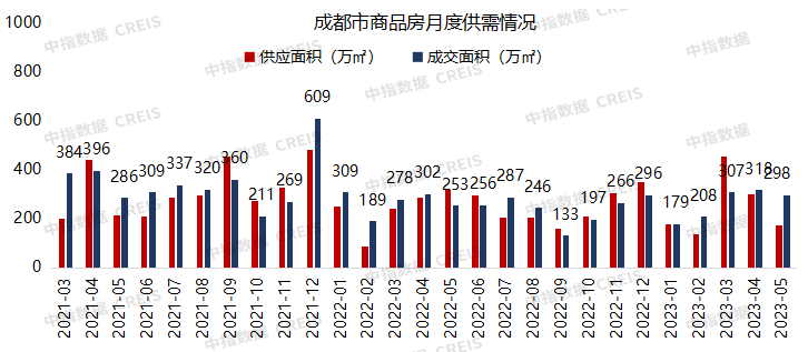 5月,成都商品房供应面积为167万㎡,同比下降48%,环比下降45%。成交面积为298万㎡,同比上升18%,环比下降6%。