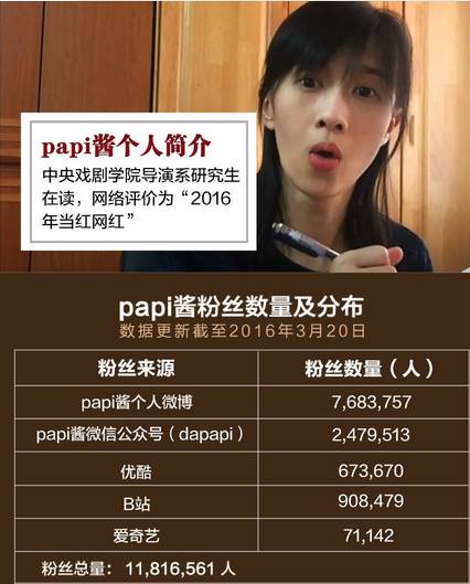 (Papi酱个人微博粉丝7683737人;个人微信公众号粉丝2479513人;优酷视频粉丝量673670人;B站粉丝908479人;爱奇艺粉丝71142人。)