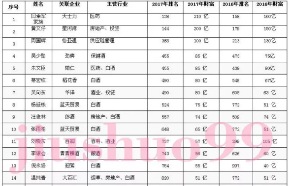 2017年胡润百富榜上榜酒类行业企业家名录