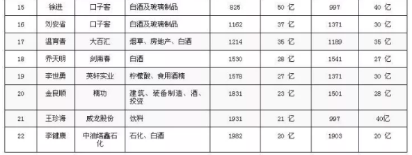 10月12日,胡润研究院发布《胡润百富榜2017》,今年是胡润研究院自1999年以来连续第19次发布“胡润百富榜”,上榜门槛已连续五年保持20亿元,本次中国区上榜人数为2130人,小编在茫茫人海中找出了与酒类产业有直接关系的22人,他们多为酒类生产企业的一把手,各位酒粉儿,你们的人生目标有了!