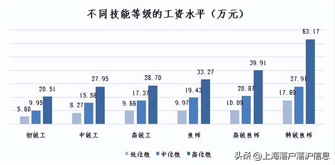 从工资中位数看,首席技师工资超初级工3倍。首席技师、特级技师、高级技师、技师分别为30.33万元、27.91万元、20.87万元、19.43万元,而高级技师的高位数将近40万元。