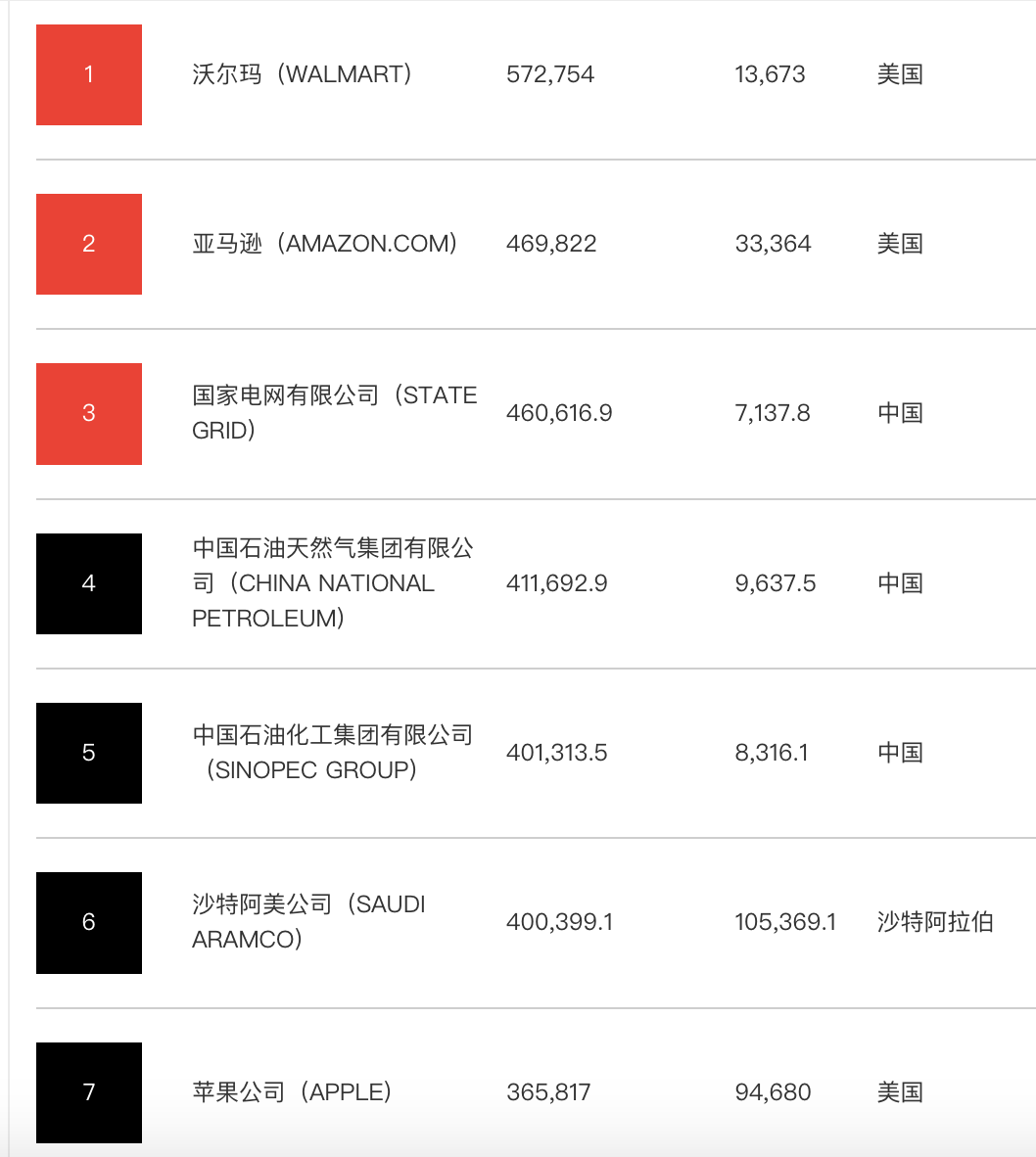 美国上榜企业占上榜企业总营收的30%。榜单前五名中,三家企业来自中国,分别是国家电网、中石油、中石化。