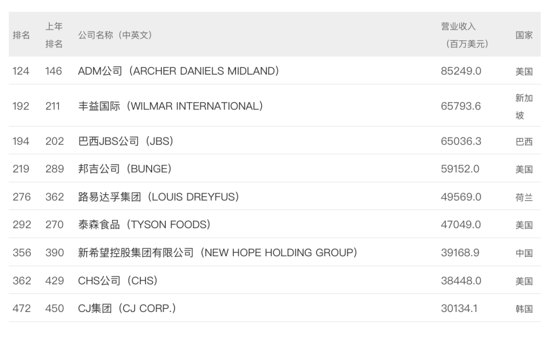 外,接下来的排序对比上年在内部发生了变动,今年依次是:丰益国际、巴西JBS公司、邦吉公司、路易达孚集团、泰森食品、新希望控股集团有限公司、CHS公司、以及今年新划分在这一子榜单上的CJ集团。