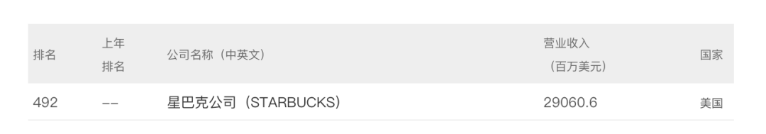 引人关注的是,星巴克今年重返世界500强榜单了,并替代康帕斯集团成为了这一子榜单的“独苗”。