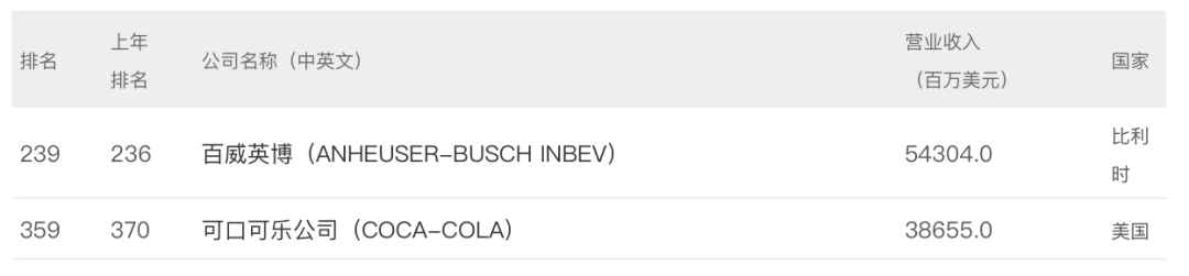 在总榜单中,百威英博今年排第239名,比去年略微下降了3名;而可口可乐排第359名,上升了11名。