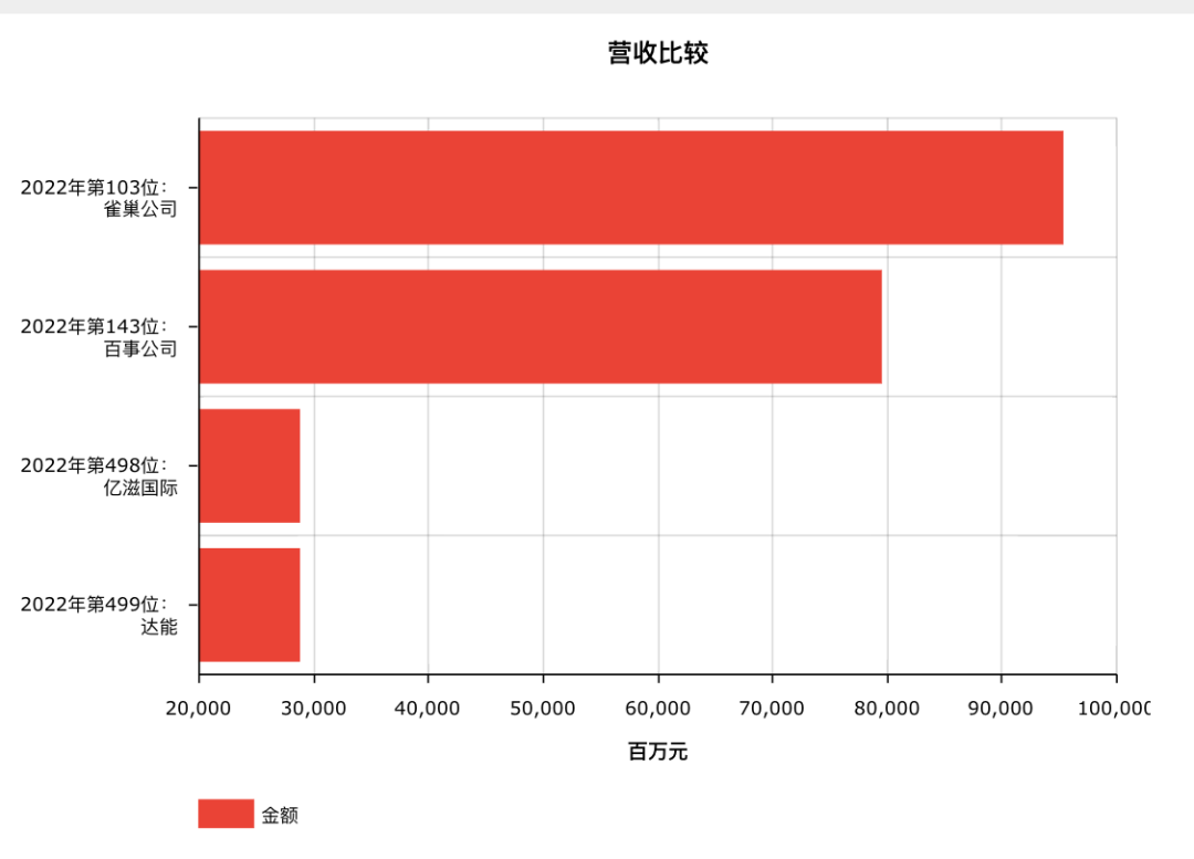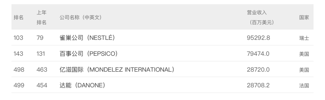 亿滋国际以287.2亿美元的营收,在500强中排第498名,下降了35名。达能则以287.082亿美元的营收,紧挨着亿滋排第499名(下降了45名),这两家公司凭借在总榜单中“吊车尾”的排名“惊险”地保住了最新的500强席位。