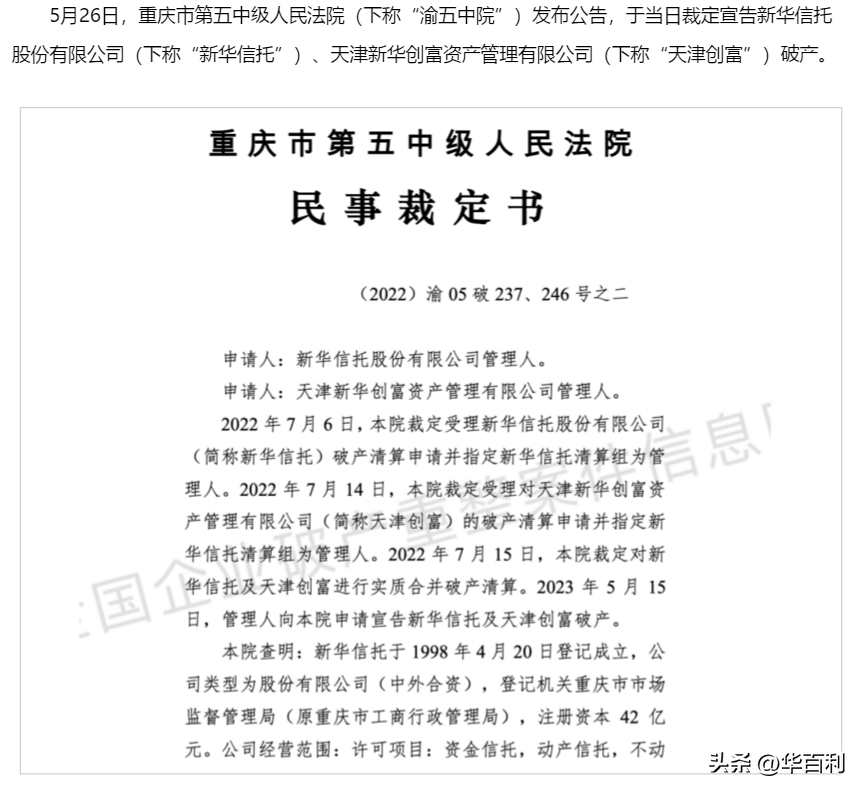 5月26日,重庆市第五中级人民法院(下称“渝五中院”)发布公告,于当日裁定宣告新华信托股份有限公司(下称“新华信托”)、天津新华创富资产管理有限公司(下称“天津创富”)破产。