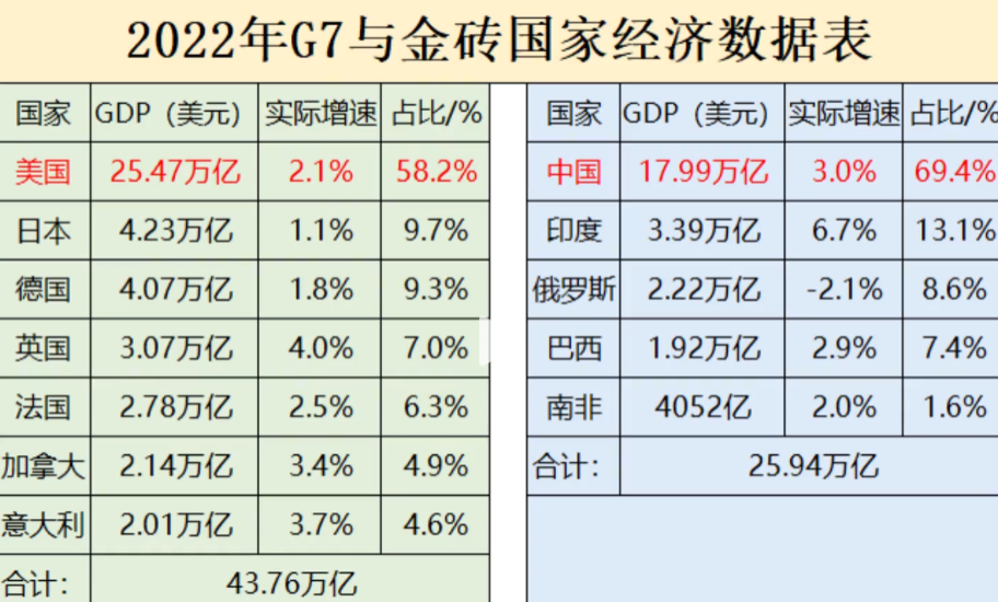 目前的GDP情况:美国=金砖五国之和,而中国=G6(除美国外)之和!