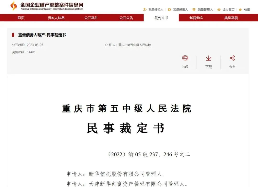 根据5月26日公布的裁决书,以2022年7月6日为基准点,新华信托及关联的天津新华创富资管在破产条件下固有财产评估总值约29.84亿元。