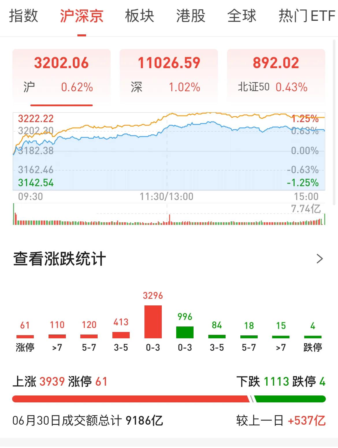 上证成交3597个亿(前一个交易日3506个亿),第一个30分钟成交977.3个亿(前一个交易日.第一个30分钟930.8个亿);创业板成交2451亿(前一个交易日2273亿);科创50成交752亿(前一交易日705亿)。