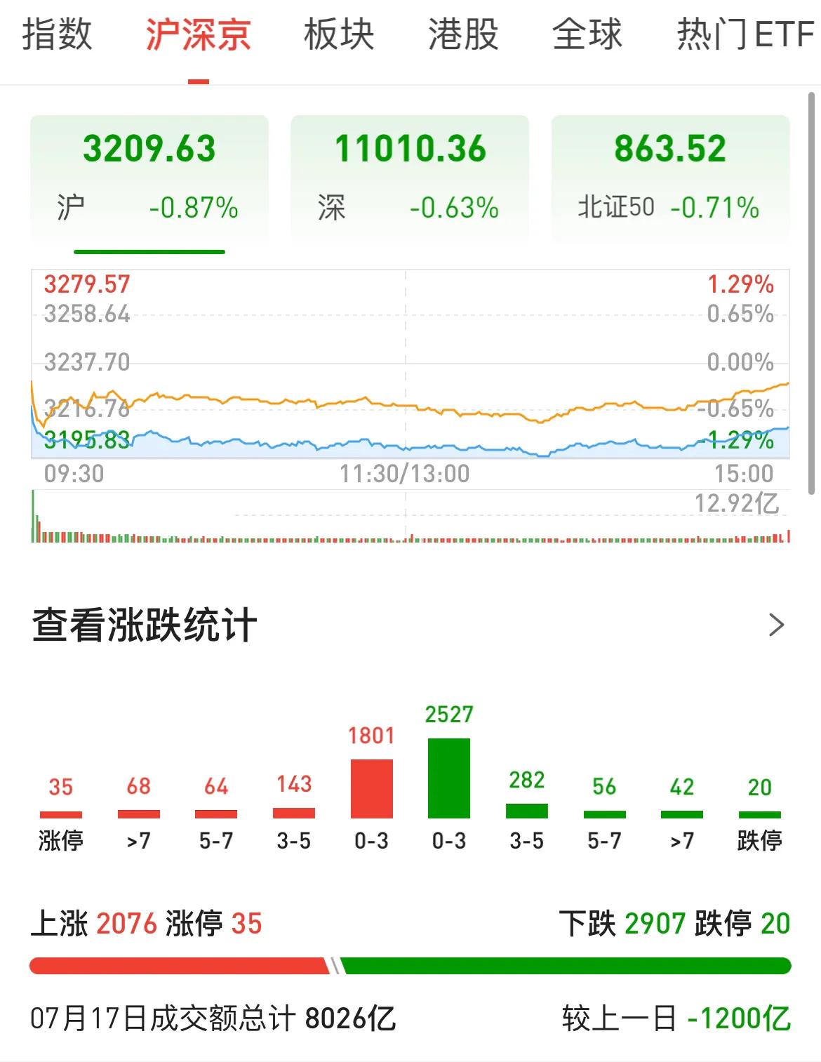 上证早盘低开18个点,全天窄幅震荡,尾盘缩量下跌-0.87%;市场35家涨停,减少8家;跌停20家,增加8家!今天¥船舶、电信运营、农林牧渔等板块领涨!(¥煤炭、保险、互联网领跌!)