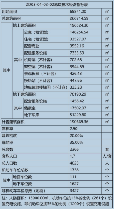 该项目的用地面积为65841平米,总建筑面积为266714.59平米,包含196524.3平米的地上建筑面积以及70190.29平米的地下建筑面积。其中,地上建筑面积包括:公寓(租赁型)146256.54平米、住宅(租赁型)33527.07平米、配套商业3552.16平米、配建服务设施7333.59平米……此外,该项目的容积率为2.9,建筑密度为20%,绿地率为35%,规划总套数为2366套,机动车位为1738个!