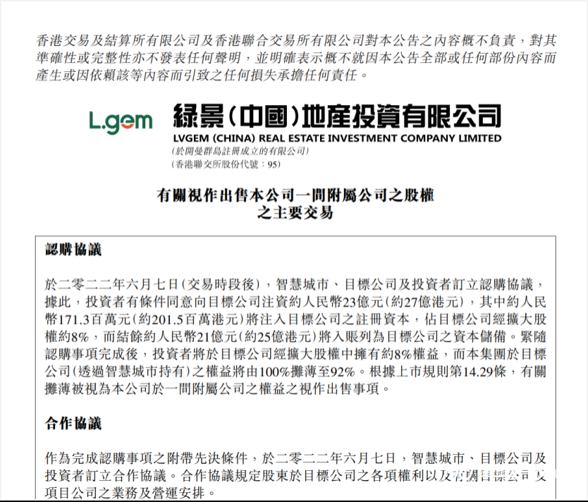 据公告显示,绿景中国旗下智慧城市发展有限公司、深圳市四达实业发展有限公司,与万科旗下深圳市深全房地产开发有限公司订立认购协议。万科将向四达实业注资约23亿元,其中约1.71亿元将注入注册资本,占四达实业经扩大股权约8%,而结余约人民币21亿元将入账列为四达实业资本储备。