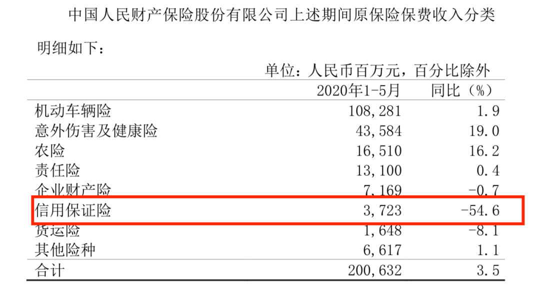 值得一提的是,人保财险2017年-2019年信用保证险保费收入分别为49.42亿元、115.75亿元、227.67亿元,同比增速均翻倍。而在日前公布的今年1-5月的保费数据中,该业务出现大幅萎缩,同比下降超50%。