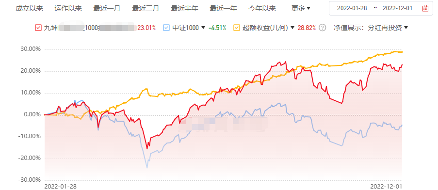 九坤1000指增代表产品自购后的绝对收益达到23.01%,累计超额接近30%,
