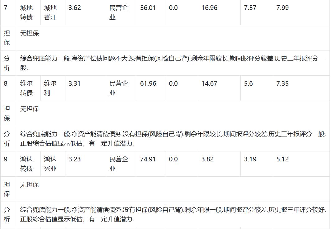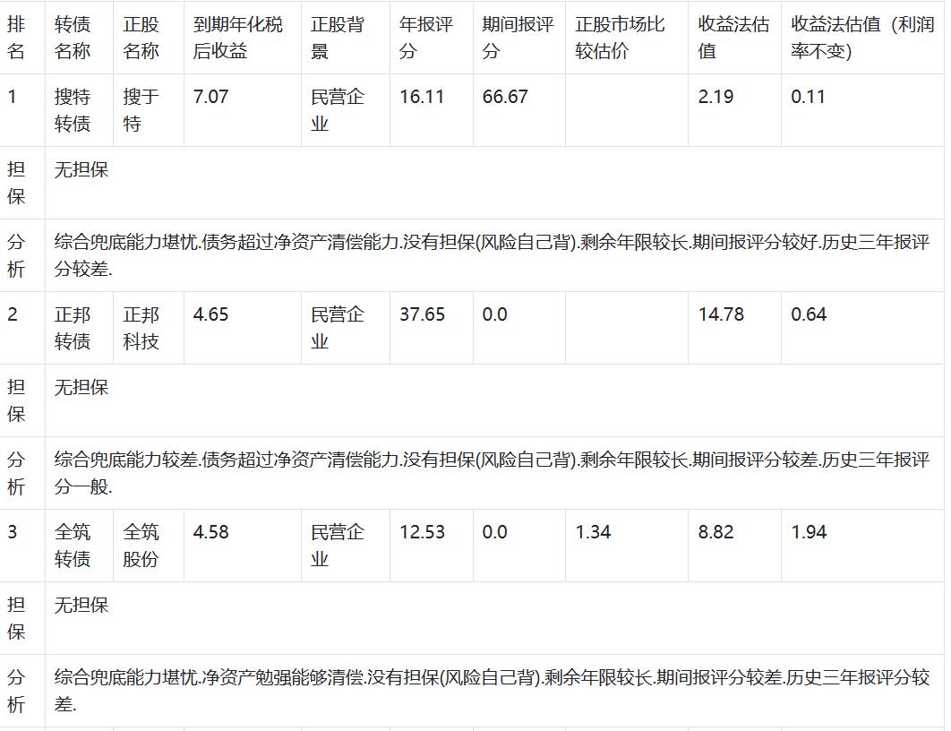 到期税后收益第一名仍为搜特转债,为7.07%,但其从担保和财务情况来看风险巨大,净资产扣商誉已为负数。