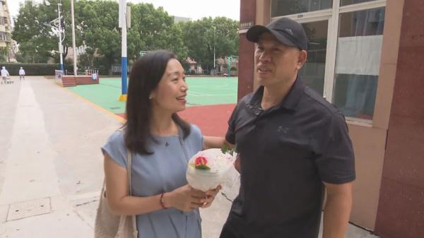 转眼23年过去,在今天这个特别的日子,当年12对新人之一的徐荆武早早便守候在七宝中学校门口,接妻子黄瑛一同回家,而除了这束鲜花与满满祝福,徐荆武还带来了记者为他们准备的两人当年举办集体婚礼时的新闻视频。