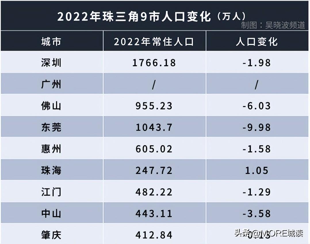 如果把视线拉向整个珠三角,也是同样的情况。比如东莞,2022年人口减少9.98万人,佛山人口减少6.03万人,惠州人口减少1.58万人……