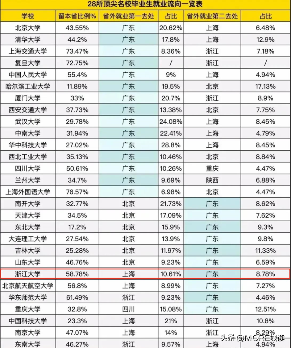 据调查,浙江大学中60%的人都会选择在浙江省内就业,这些人里80%的人都选择了杭州。