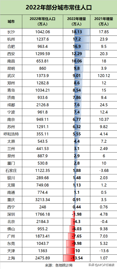 目前,长沙、杭州、合肥成为了人口增长前三甲,2022年常住人口分别增长18.13万人、17.2万人、16.9万人。