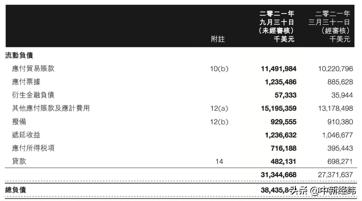 截至2021年9月30日,达313.45亿美元(约合2032.83亿元人民币)。其中,由于应付贸易账款的金额较高,