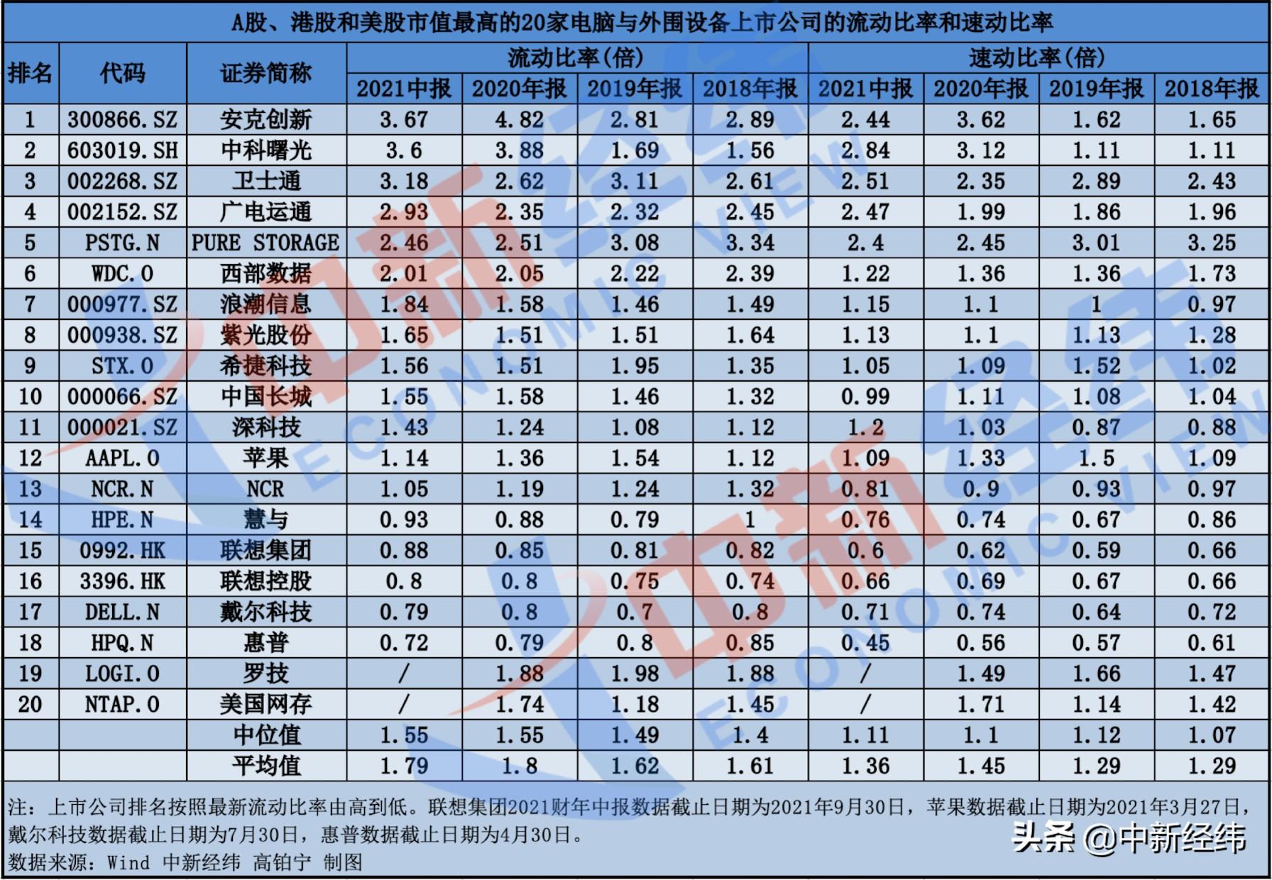 对比行业,中新经纬仍以A股、港股和美股市值最高的20家电脑与外围设备上市公司的财务数据为例,这20家企业2021年上半年的流动比率中位值、平均值分别为1.55倍、1.79倍,均明显高于联想集团的0.88倍;上述20家企业2021年上半年的速动比率中位值、平均值分别为1.11倍、1.36倍,明显高于联想集团的0.6倍。