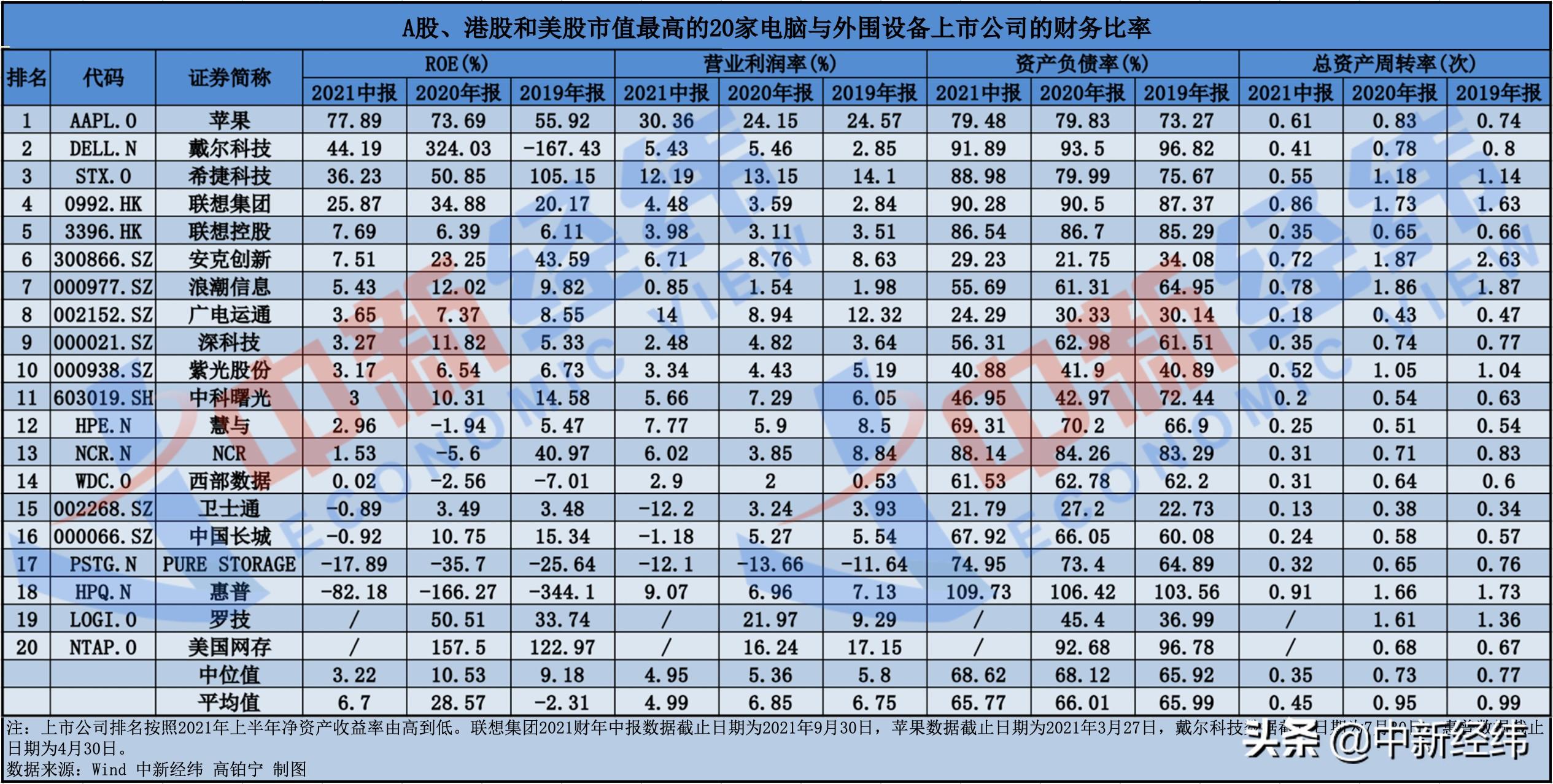 而从行业看,中新经纬选取A股、港股和美股市值最高的20家电脑与外围设备上市公司进行比较,由于部分公司2021年三季报尚未披露,故截取了2021年上半年的财务数据。Wind数据显示,这20家公司2021年上半年的资产负债率中位值、平均值分别为68.62%、65.77%,联想集团截至6月30日的资产负债率为89.72%,明显高于行业均值。在头部企业中,惠普的负债率达109.73%,戴尔的负债率达91.89%,高于联想集团负债率。