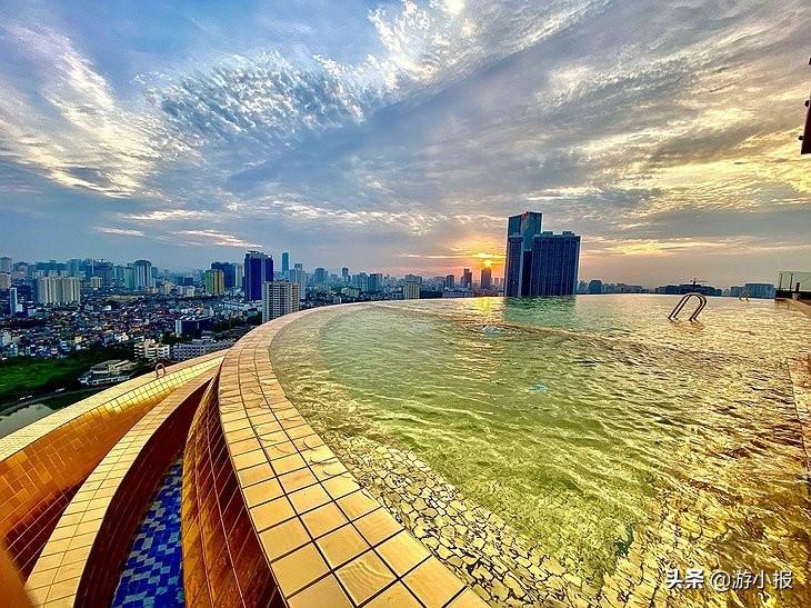 日落时分,在太阳的照射下,金色瓷砖和水折射出绚烂的光芒,再加上河内的天际线景色,非常值得一看。