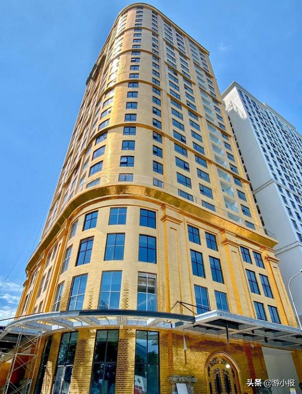 这座 25 层的建筑,外立面覆盖了近 5,000 平方米的镀金瓷砖,号称足足用了一吨的黄金。不仅如此,连酒店大堂、电梯、甚至客房也全部使用24K 的镀金家具。