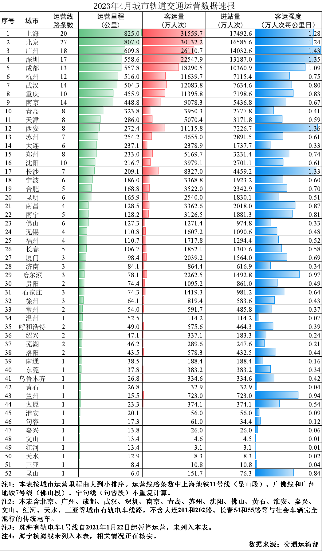 根据交通运输部最新数据,2023年4月,31个省(自治区、直辖市)和新疆生产建设兵团共有54个城市开通运营城市轨道交通线路292条,运营里程9652.6公里,实际开行列车311万列次,完成客运量25.3亿人次,进站量15.2亿人次。