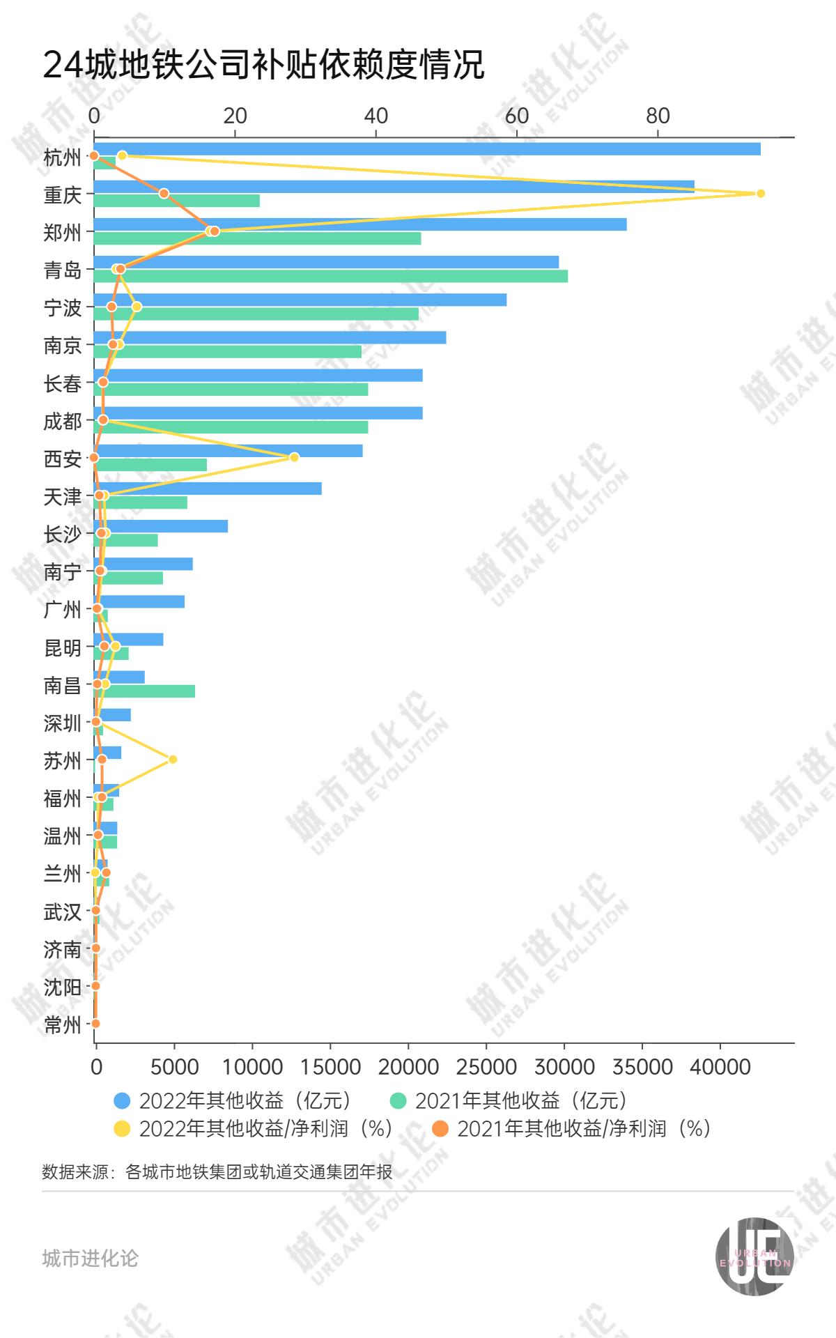 在“其他收益/净利润”指标中,2022年有18座城市超过100%,其中重庆、西安、郑州和苏州地铁公司对补贴的依赖度较高,而深圳、济南和武汉地铁公司对补贴的依赖度较低,比重分别为61.32%、11.91和5.53%。