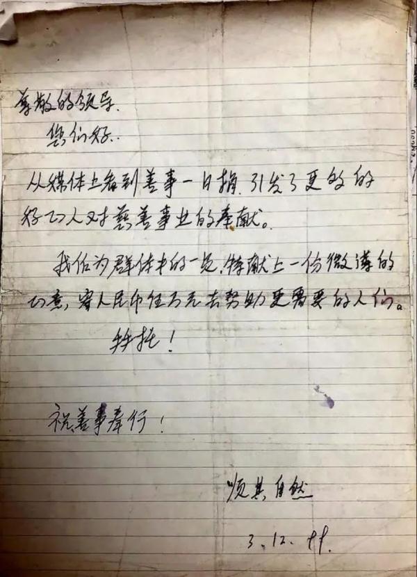 当年,宁波市慈善总会收到了一封署名“顺其自然”的挂号信,里面除了5万元的捐款单据外,还附了一封简短的信,上面写着“从媒体上看到善事一日捐,引发了更多好心人对慈善事业的奉献。我作为群体中的一员,特献上一份微薄的心意,寄人民币伍万元去帮助更需要的人们。拜托!”