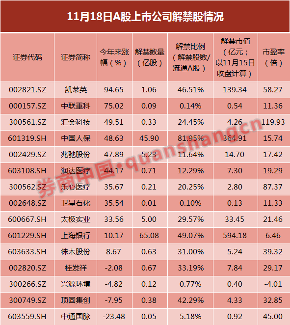 与中国人保一同于11月18日迎来解禁股上市的还有多只股票,包括凯莱英、中联重科、汇金科技、上海银行等。为何中国人保跌势较大?