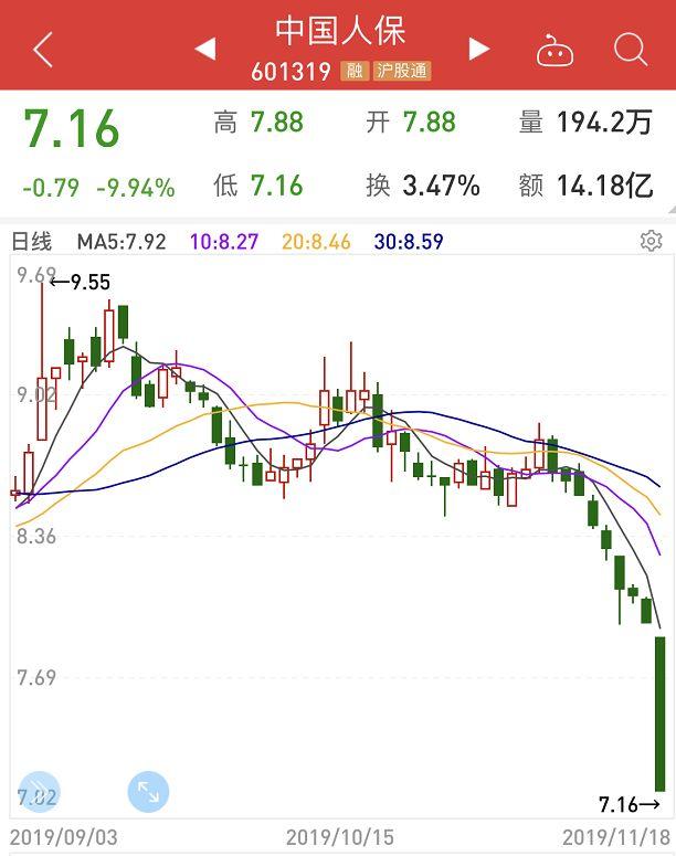 11月18日,中国人保低开低走,盘中持续下挫,截至收盘,中国人保下跌9.94%,报价7.16元,一天蒸发近300亿。此前,中国人保已连续走跌7个交易日。短短8个交易日,中国人保A股市值蒸发超530亿。